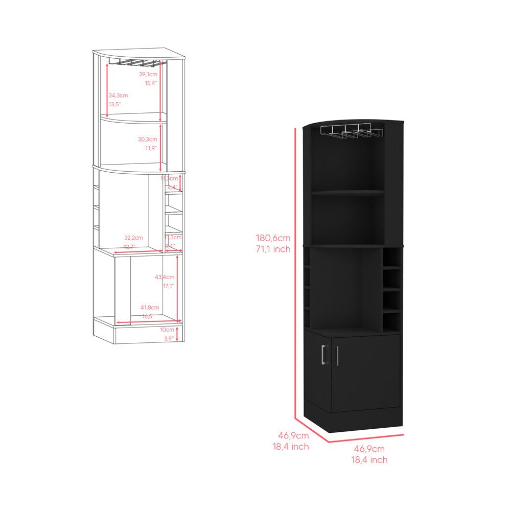 Atanasio Corner Bar Cabinet. This contemporary piece features a classic and modern style, making it perfect for any home bar. Plus, with 8 wine cubbies (4,4''H X 4,4''W), two ample open shelves (18,8''W X 15,7''H), and a double door, this cabinet has plenty of room to store your drinks or prepare your favorite cocktails. It also includes a fantastic rack. This cabinet will complement any decor. Designed with elegant black manufactured wood finish.Dimensions:Height: 71,1"Width: 18,4'Depth: 18,4''Furniture Type: Ready to assemble (full assembly required).Certifications: CARB phase II compliant – TSCA Title VI Compliant.Warranty: 1-year warranty coverage in wooden parts 1 year warranty coverage in hardware pieces since its manufacturing date is found in the lot number printed in the product box.Shipment details: Free shipping to the 48 contiguous states delivery time: Between 2 and 5 days depending on the customer's location, season, and weather factors.Other details: This product does not include decorative or background elements; Check that the box is in good condition, and well packed, and check with the help of the manual that the corresponding parts have been included; For more information regarding warranty, shipment details, cancellations, returns & replacement parts go to the bottom section of our website to learn more; Installation & Assembly Instructions included.