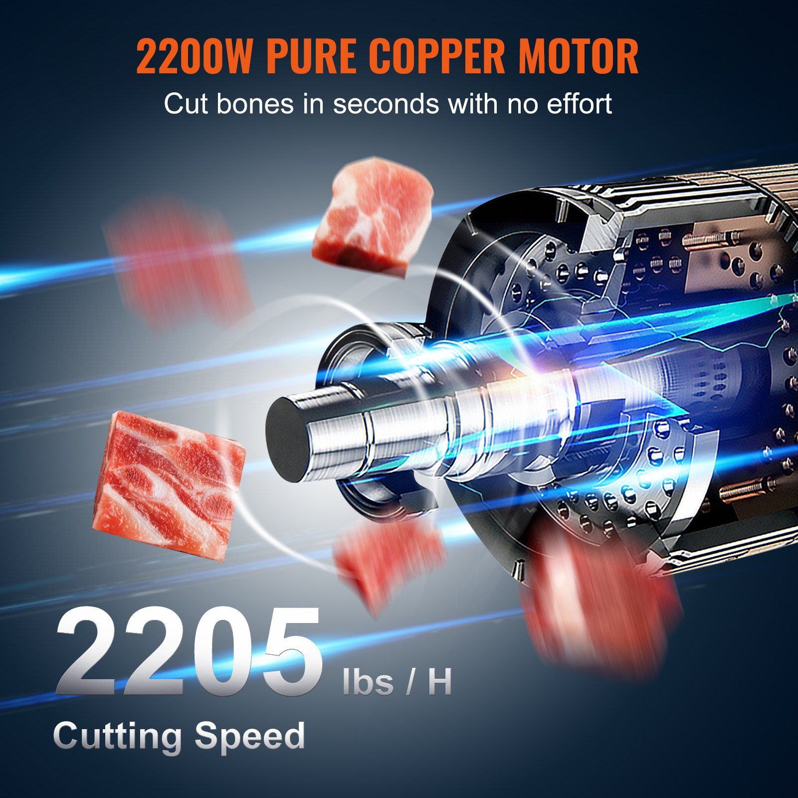 Our bone saw machine is powered by a 2200W pure copper motor to deliver unmatched strength. Combined with sharp stainless steel blades and precision gears, it ensures seamless cutting with an efficiency of up to 2205 lbs/H. With a gentle push, you can slice through the tough bones and frozen meat.