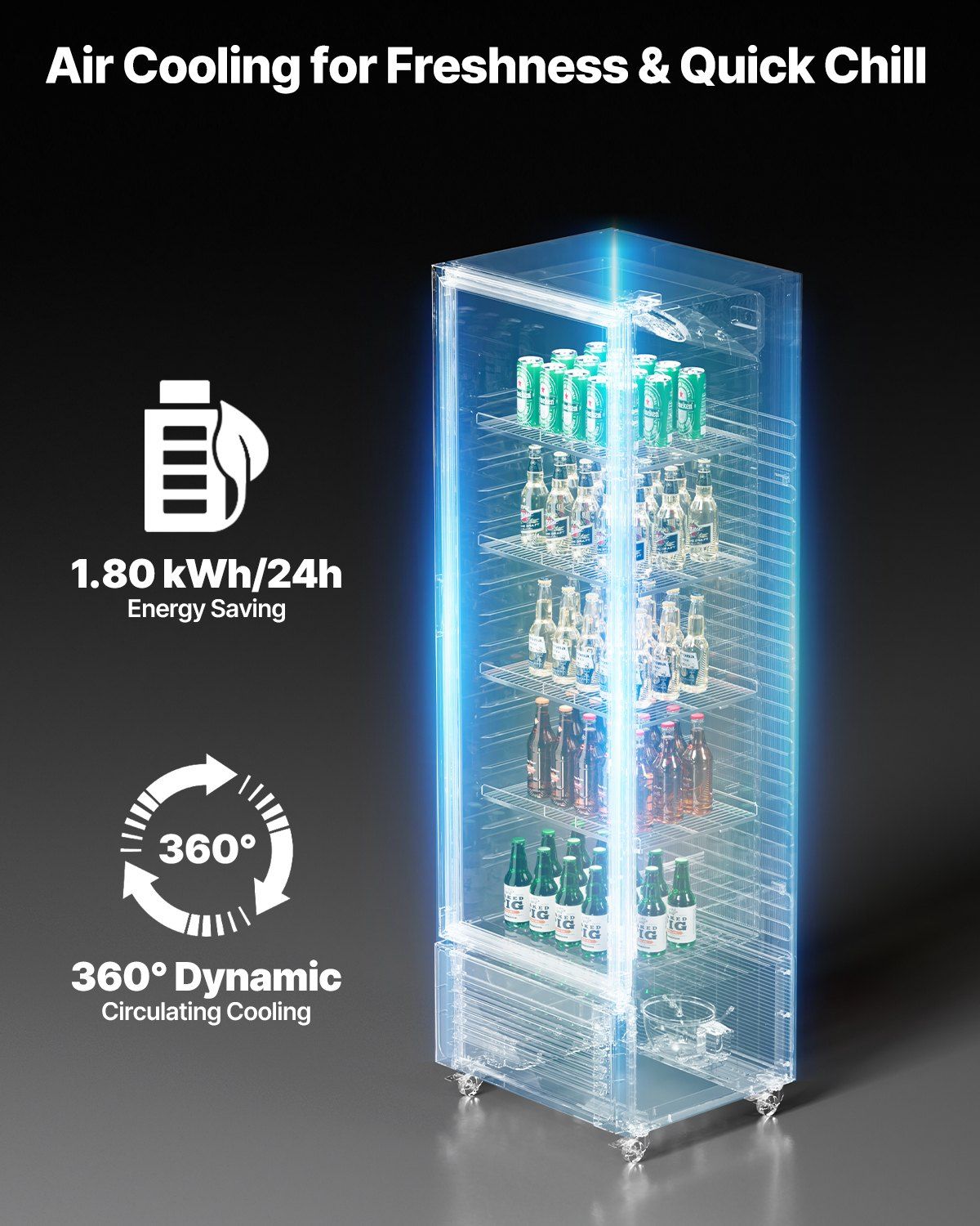 3.Fast Cooling: Our beverage refrigerator cooler merchandiser boasts a powerful compressor and 7-level temperature control (32ºF-50ºF / 0°C-10°C). With an air cooling system, it ensures uniform cooling, chilling your drinks in 45 minutes